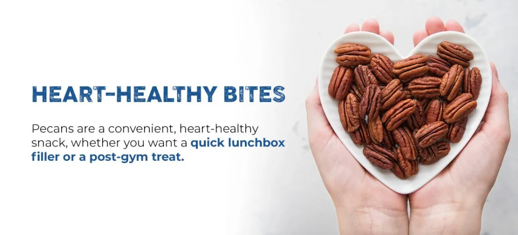 How can pecans support heart health when one serving contains 20 grams of fat? Not all types of fat are equal. One serving of pecans mainly consists of heart-healthy mono- and polyunsaturated fats. Both of these unsaturated fats can decrease LDL cholesterol, or the “bad” cholesterol, and increase HDL cholesterol, or the “good” cholesterol. Pecans are a convenient, heart-healthy snack, whether you want a quick after-school snack or a post-gym treat.